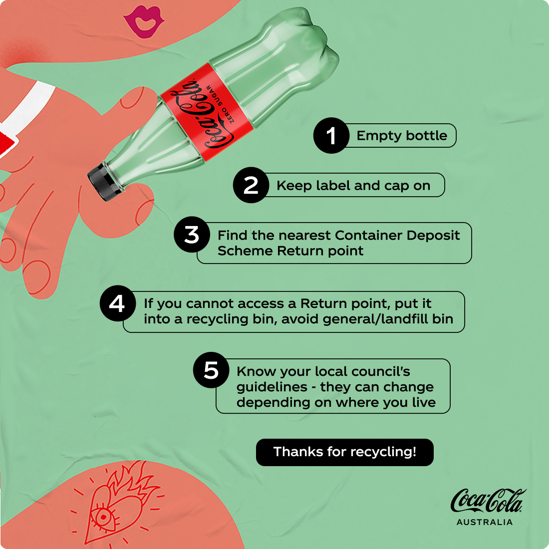In Australia all our soft drink and water plastic bottles under 1 litre are made from 100% recycled plastic (excluding caps and labels).