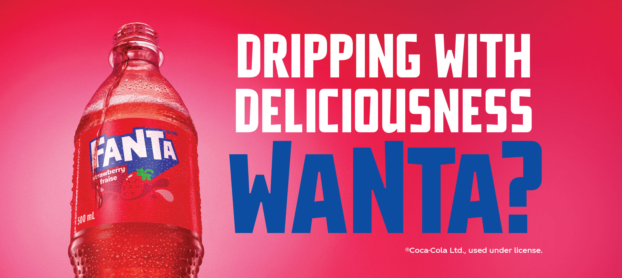 Fanta® Strawberry comes in a variety of different sizes and is available in stores where Fanta® products are sold. Bottles and cans are made, merchandised, distributed and sold in partnership with Coke Canada Bottling.
