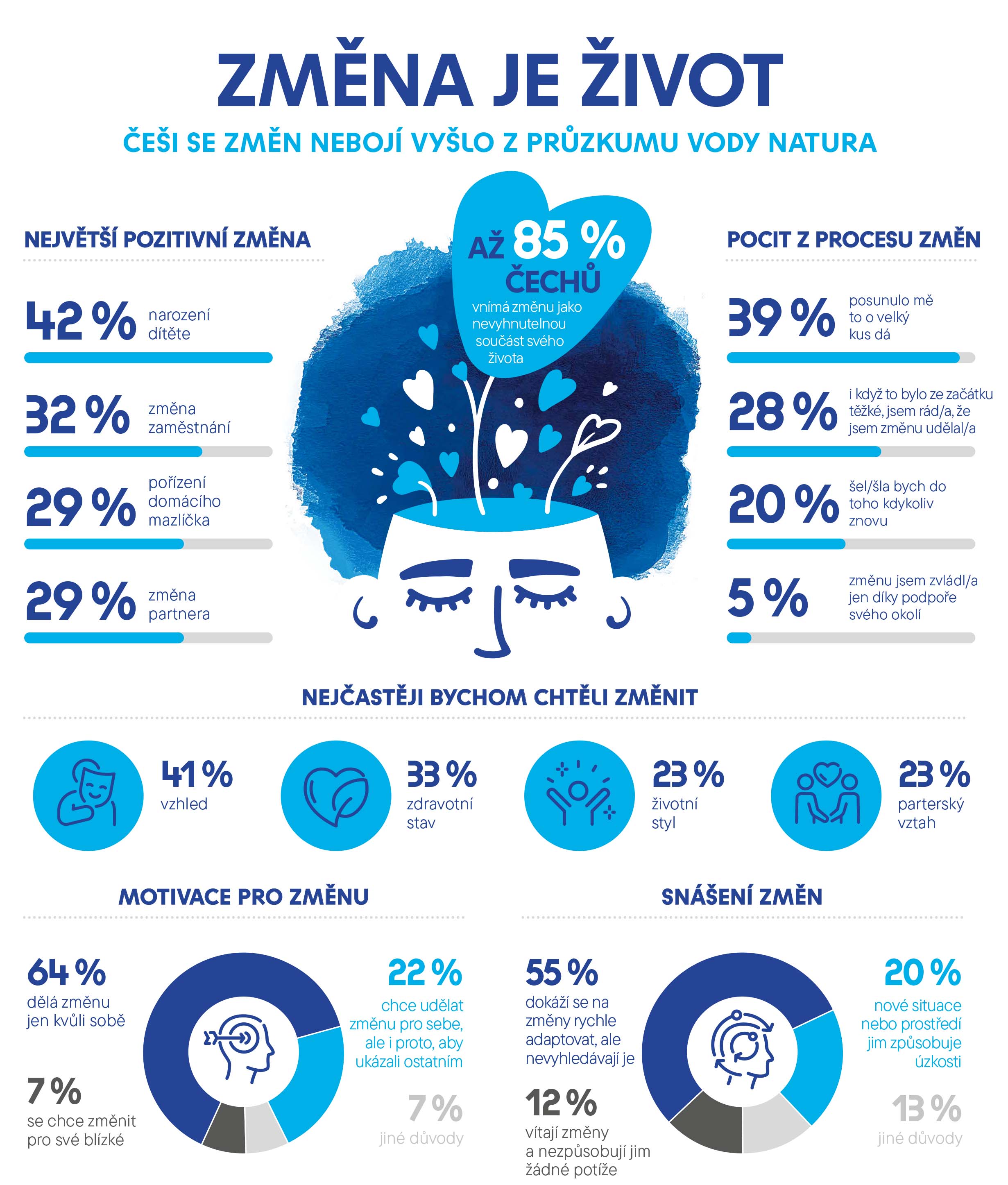 Změny tvoří nevyhnutelnou součást života. Shodne se na tom 85 % Čechů. Vyrovnat se s nimi může leckdy představovat výzvu, ale respondenti průzkumu uváděli, že to přináší své ovoce. Téměř 40 % Čechů životní změny posunuly o velký kus dál, zatímco 28 % z nich je rádo, že změnu podstoupili, ačkoli to ze začátku nebylo snadné. Pětina respondentů pak deklaruje, že by velkou životní změnu udělali kdykoli znovu.