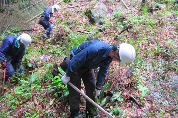 人工林の下刈・除伐・間伐作業を年間通して実施しています。また放置され荒廃した山林の機能回復を図るために枯損木等の伐倒整理、植林施業を行っています。また、小学生に森林のはたらきについて興味を持ってもらうために、学校を訪問しての環境学習、実際に森林内での体験学習(植林)を行っています。