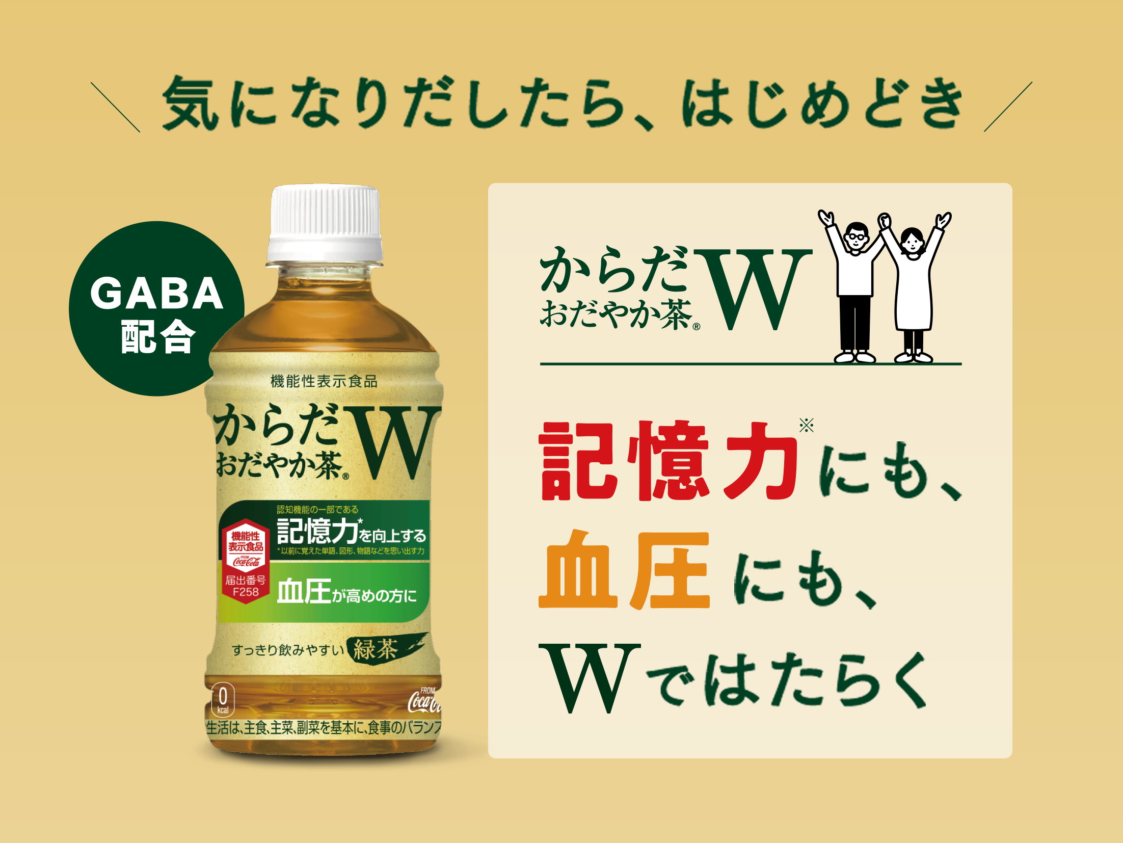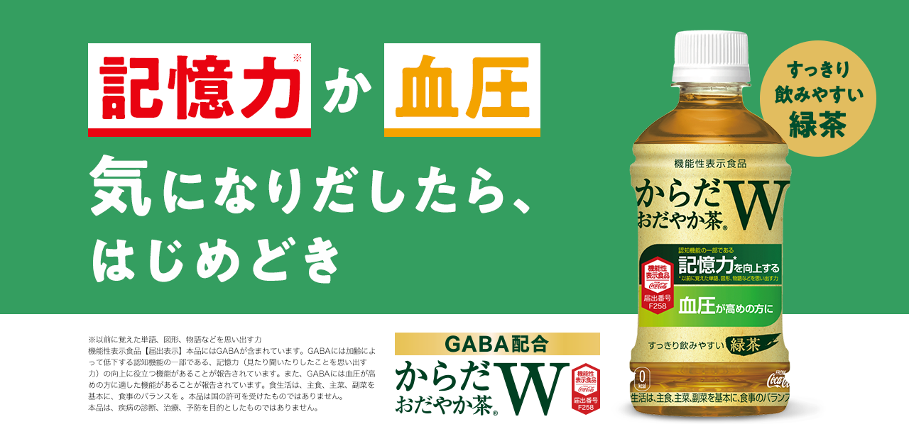 「からだおだやか茶W」は、記憶力*と血圧にWではたらくGABAを配合した、機能性表示食品の緑茶です。