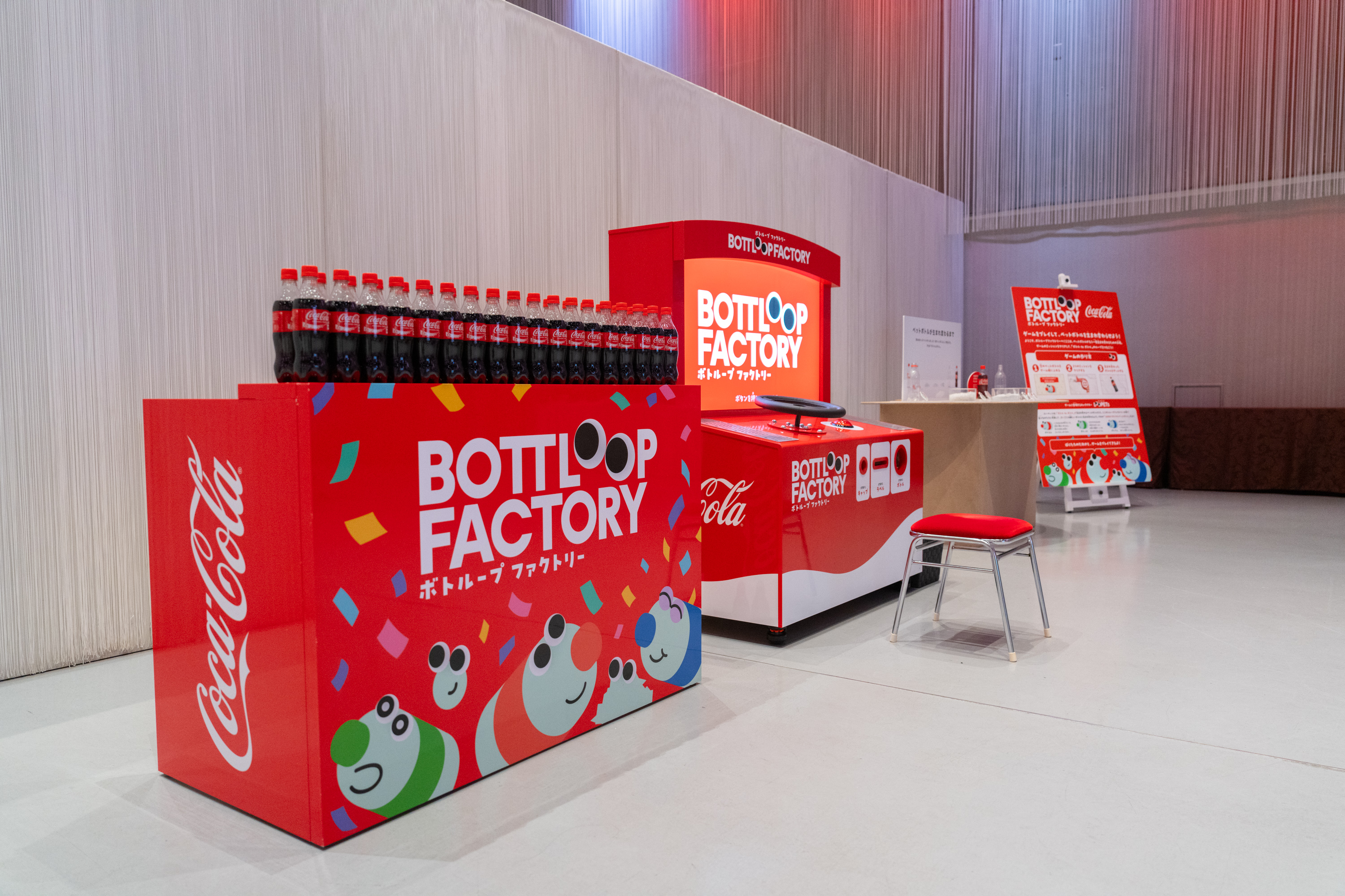 ボトループファクトリーはペットボトルをもう一度ペットボトルとして再生する「ボトル to ボトル」の工程をゲーム化したマシンです。