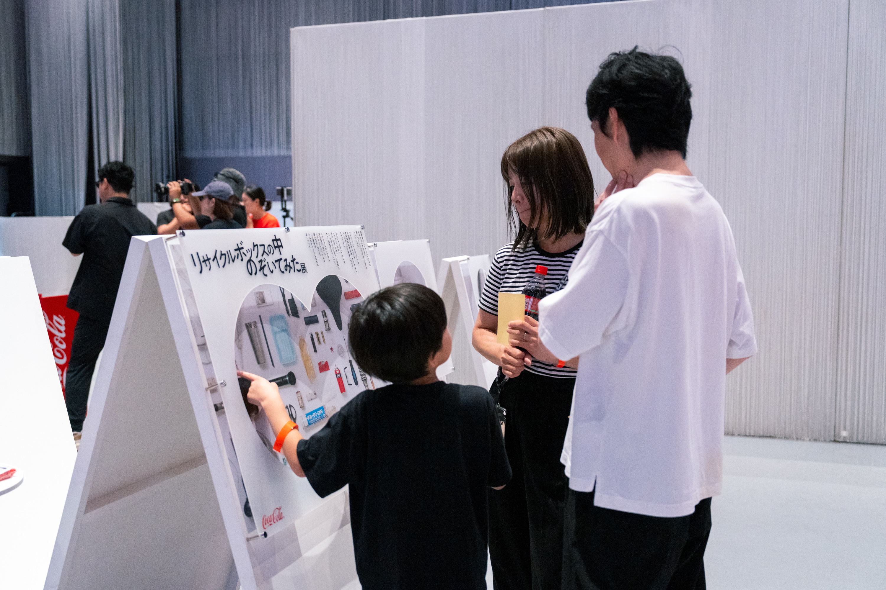 会場では、「リサイクルボックスの中のぞいてみた展」も実施。これは、2023年のリサイクルの日にコカ・コーラが開催した展覧会形式のイベントで、街中のリサイクルボックスから実際に回収された、PETボトル以外の“ありえない廃棄物”の写真を展示したものです。