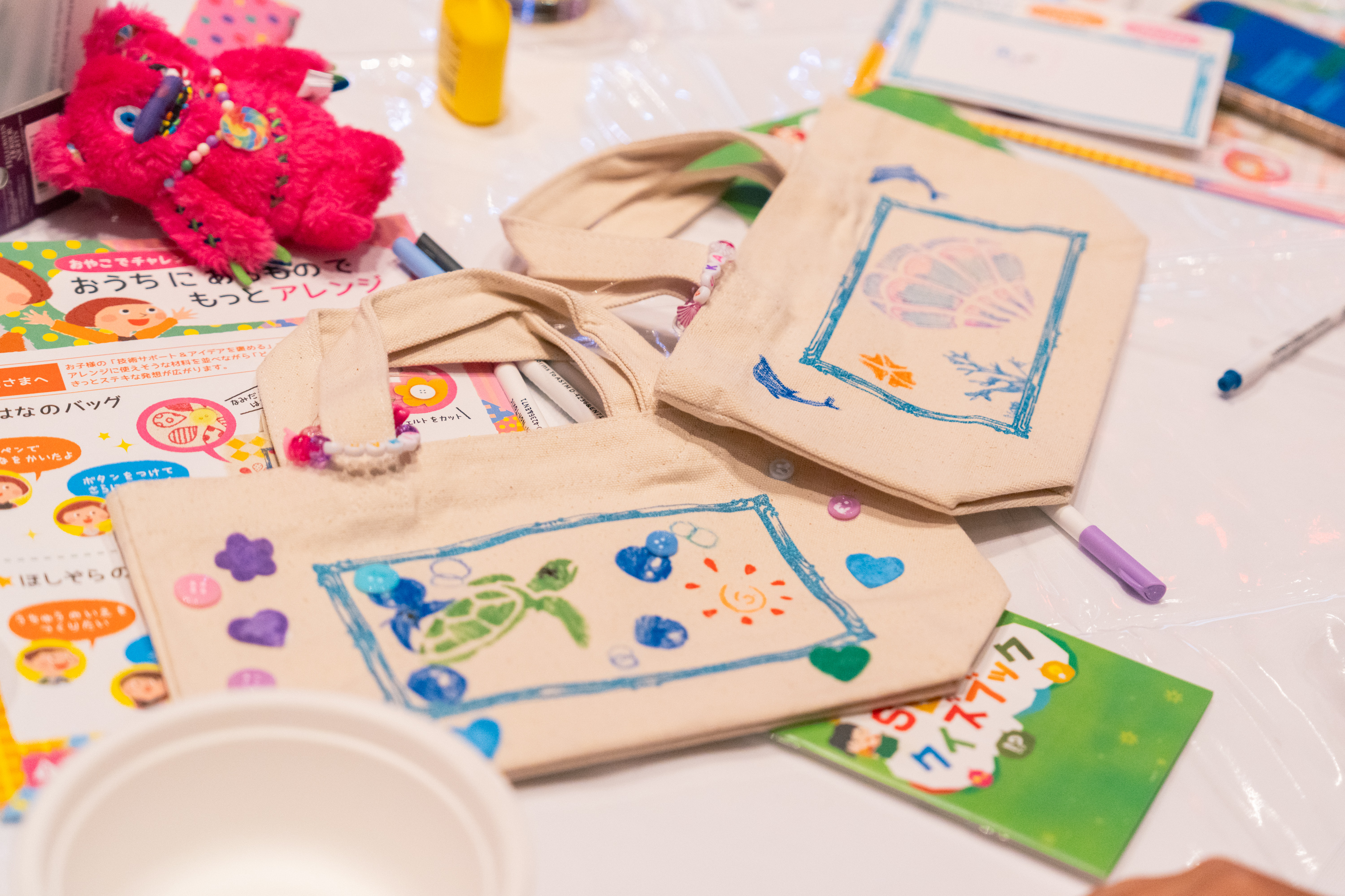 さらに、エコバッグづくりのワークショップも行われました。毎年9月の終わりごろに世界的に展開される「グローバル・ゴールズ・ウィーク」に合わせ、SDGsの目標である「海の豊かさを守ろう」「陸の豊かさも守ろう」にちなんだテーマを設定。海・花・動物の3つをモチーフに、参加者の方々に自分だけのオリジナルバッグを作成いただきました。