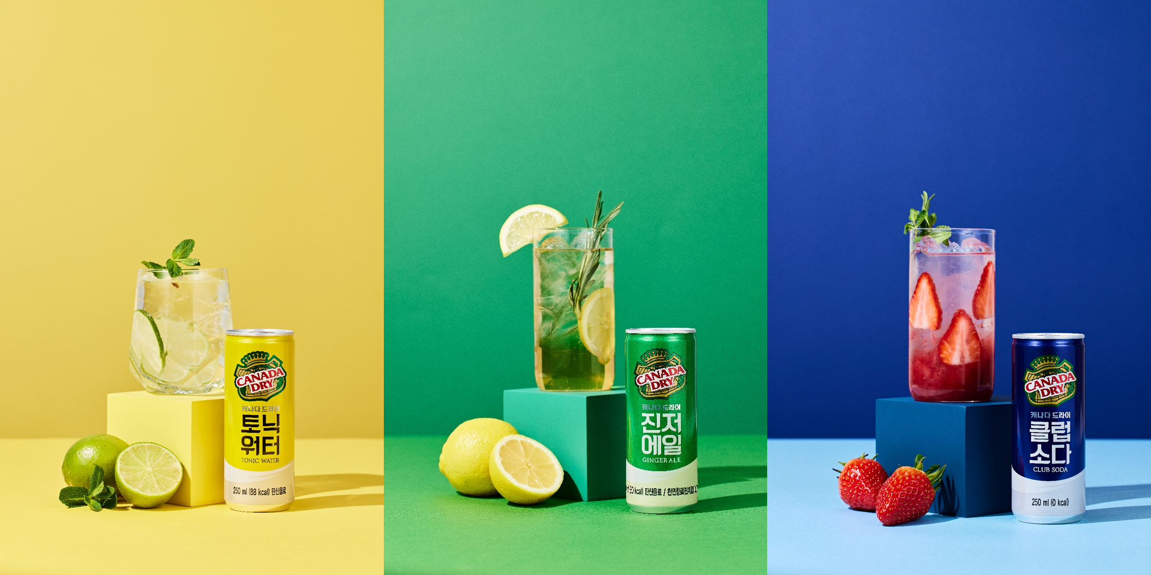 노란색의 토닉워터는 달콤하면서도 쌉쌀하고, 상큼한 레몬향이 기분 좋게 식도를 적신다. 초록색의 진저에일은 달콤하면서도 풍성한 맛이 느껴졌으며, 살짝 알싸한 생강향이 풍미를 더해준다. 파란색의 클럽소다는 무향, 무당의 깔끔한 맛으로, 제로 칼로리라 언제 어디서든 부담 없이 마실 수 있다.