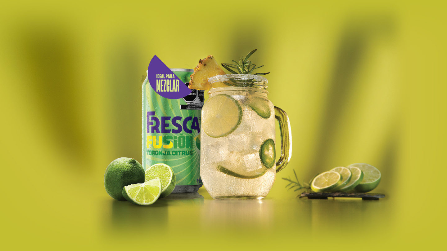 Escarcha el borde de una vaso alto o highball con la sal, pon en el vaso la piña, el jarabe de chile, jarabe naturalel, el jugo de limon y machacalo con intensidad dentro del vaso. añade hielo al gusto, agrega Fresca Fusión. Mezclar bien la bebida con una cuchara de bar y aladira la rodaja de piña, la ramita de romero y las rodajas de jalapeños para decorar.